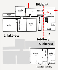 Az ingatlan két különálló, vegyes falazatú épületből áll. Az egyik épületben egy földszinti, 3 szobás, 69 m2-es 1. lakórészt találunk, valamint egy földszint + tetőtér kialakítású 60 m2-es, 2 szobás 2. lakórészt. A másik különálló épületben egy 65 m2-es, 2 szobás 3. lakórész található. Az 1. és 2. lakórészbe egy TÁGAS TÉLIKERTEN keresztül juthatunk be.