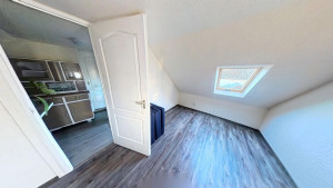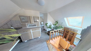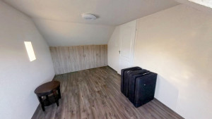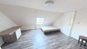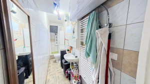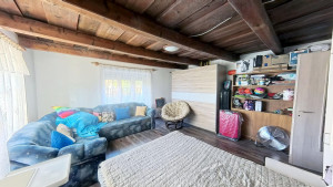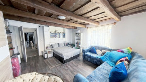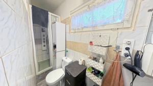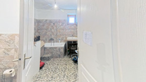 A 2. lakórész földszintjén találjuk a méretes előteret, melyben jelenleg a mosókonyha is helyet kapott, de konyhaként is remekül használható. Innen nyílik a tényleg nagy, VADONATÚJ FÜRDŐSZOBA, melyből egy külön WC nyílik, valamint egy kis szauna is kialakításra került. A fürdőszobában KÁD ÉS ZUHANYZÓ egyaránt megtalálható. Az előtérből vezet a lépcső a tetőtéri részbe. Itt két szoba és egy konyha lett kialakítva. A földszinten elektromos padlófűtés van, a tetőtérben jelenleg még nincs fűtés. Itt légkondicionálóval vagy elektromos fűtőpanelekkel megoldható a fűtés. A földszinten egy NAGY KAMRA is rendelkezésre áll, melyet tetszés szerint az 1. vagy a 2. lakrészhez is használható.