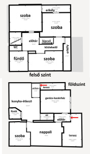 A földszintre az egyik bejáraton egy kényelmes méretű teraszról egy előszobán keresztül juthatunk be. Innen a nagyobb társaság számára is TÁGAS KONYHA-ÉTKEZŐBE érkezünk. Balra az emeletre vezető lépcső, szemben a két, igazán tágas szoba, az étkező végében a zuhanyzós fürdőszoba kapott helyet.