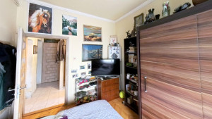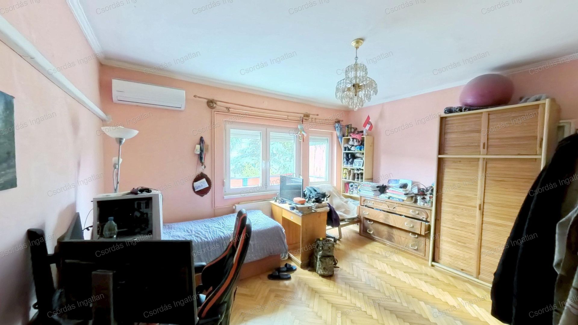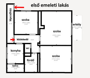 Az első emeleti lakásba egy ZÁRT LÉPCSŐHÁZON keresztül juthatunk fel. Belépve egy előtérbe érkezünk. Innen jobbra nyílik a konyha, melyhez egy kamra is tartozik. Vele szemben az egyik szoba, hűtő-fűtő klímával felszerelve, mellette egy nagyobb, tágasabb szoba van, melyről közvetlenül léphetünk ki a KERTRE NÉZŐ ERKÉLYRE. Itt is egy HŰTŐ-FŰTŐ klíma teszi komfortosabbá a lakást. Egy kis közlekedőn tovább haladva a külön WC, mellette a fürdőszoba található. A fürdőszoba mellet a harmadik szoba van.